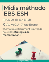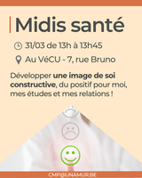Nous vous invitons à relayer cette information auprès des étudiants afin qu’ils puissent en bénéficier. Les Midis santé sont des ateliers en petits groupes, animés par deux psychologues de la Cellule Médico-Psychologique de l’UNamur. Destinés aux étudiants, ces ateliers ont pour objectif d’informer, sensibiliser et échanger autour de thématiques liées à la santé : confiance en soi, gestion du stress, sommeil, etc.