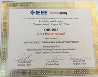 Le « QRS 2016 Best Paper Award » a été décerné à Loup MEURICE, Csaba NAGY et Anthony CLEVE pour leur papier intitulé « Detecting and Preventing Program Inconsistencies Under Database Schema Evolution ». Celui-ci avait été présenté à la « 2016 International Conference on Software Quality, Reliability and Security », qui s’est déroulé à Vienne, du 1er au 3 août 2016.